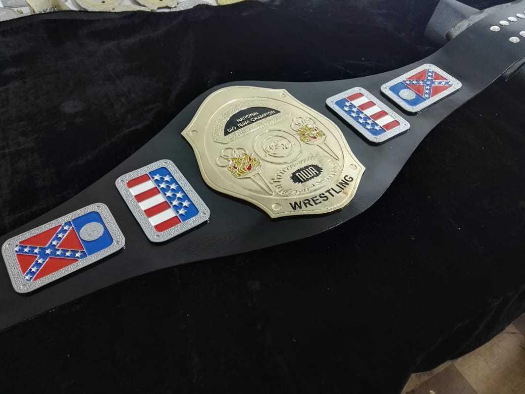 NWA NATIONAL TAG TEAM Championship Belt is made from Zinc metal, and our craftsmen do high-quality gold plating. Genuine Cowhide leather is used in making this Belt. This belt can fit waist sizes up to 46 inches. This NWA National Tag Team Championship Belt is a real deal. If you are a fan of the NWA National Tag Team Championship, This belt will help you to show your love and support to your favorite wrestlers at NWA National Tag Team Championship. Customization can be done on your demand.